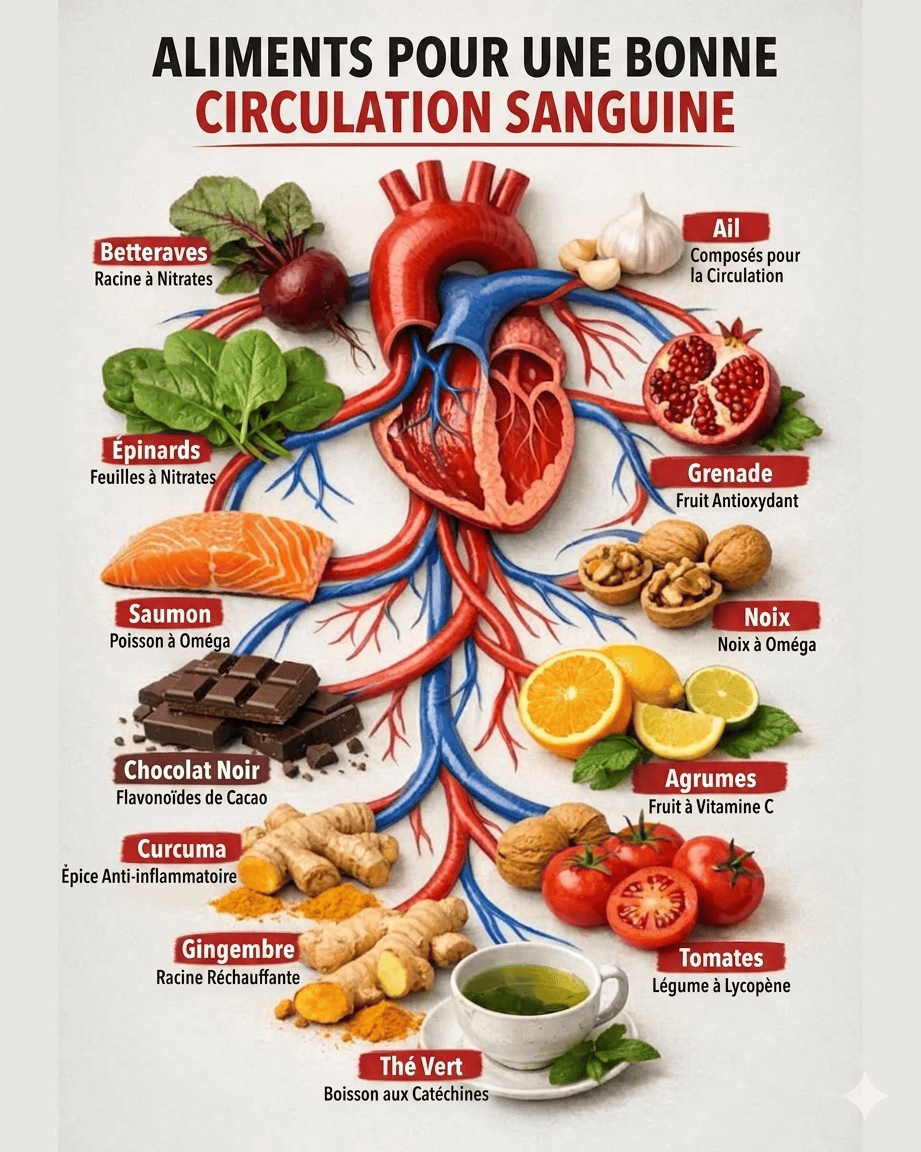 Une circulation sanguine fluide est la clé d’un corps énergique et d’un esprit alerte. Les douze aliments que nous venons de voir – ail, betterave, épinards, grenade, saumon, noix, chocolat noir, agrumes, curcuma, gingembre, tomates et thé vert – agissent chacun à leur manière : par les nitrates, les oméga-3, les antioxydants, les flavonoïdes ou les composés anti-inflammatoires.